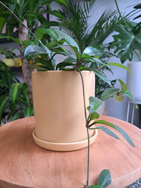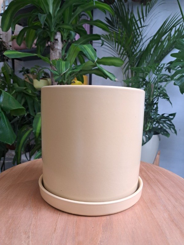 Maceta de cerámica con agujero de drenaje y plato incluido.